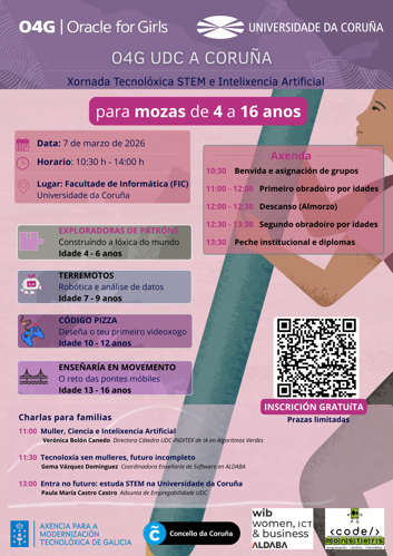 The University of A Coruña (UDC) and Oracle will celebrate a very special event on March 7th, in which the ALDABA-WIB chair will participate. The initiative is designed to bring technology closer to girls and young women, within the framework of International Women's Day. Driven by the Vice-Rectorate for Students and Employability of the UDC, it was born with a clear objective: to awaken and foster STEM (Science, Technology, Engineering, and Mathematics) vocations from an early age.